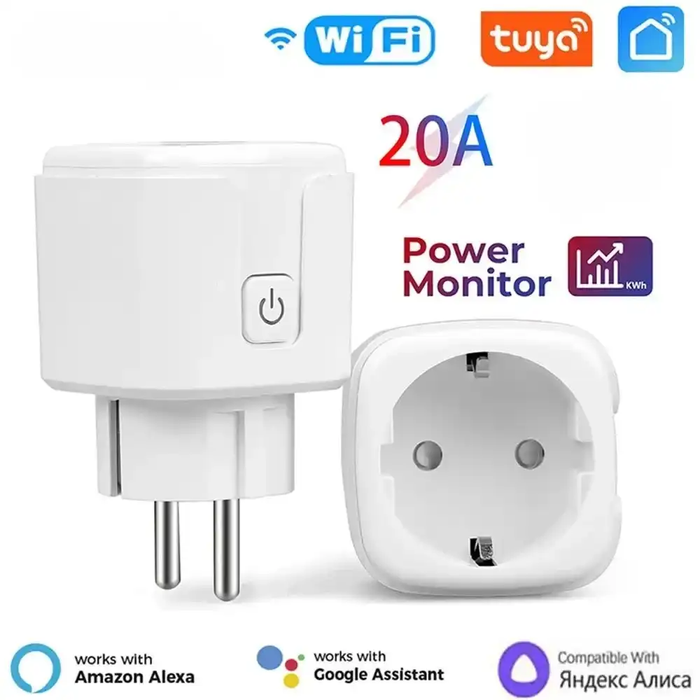 Controla tus dispositivos con el Enchufe inteligente Tuya EU20A: WiFi, 20A, monitoreo de consumo y compatibilidad con Alexa y Google.