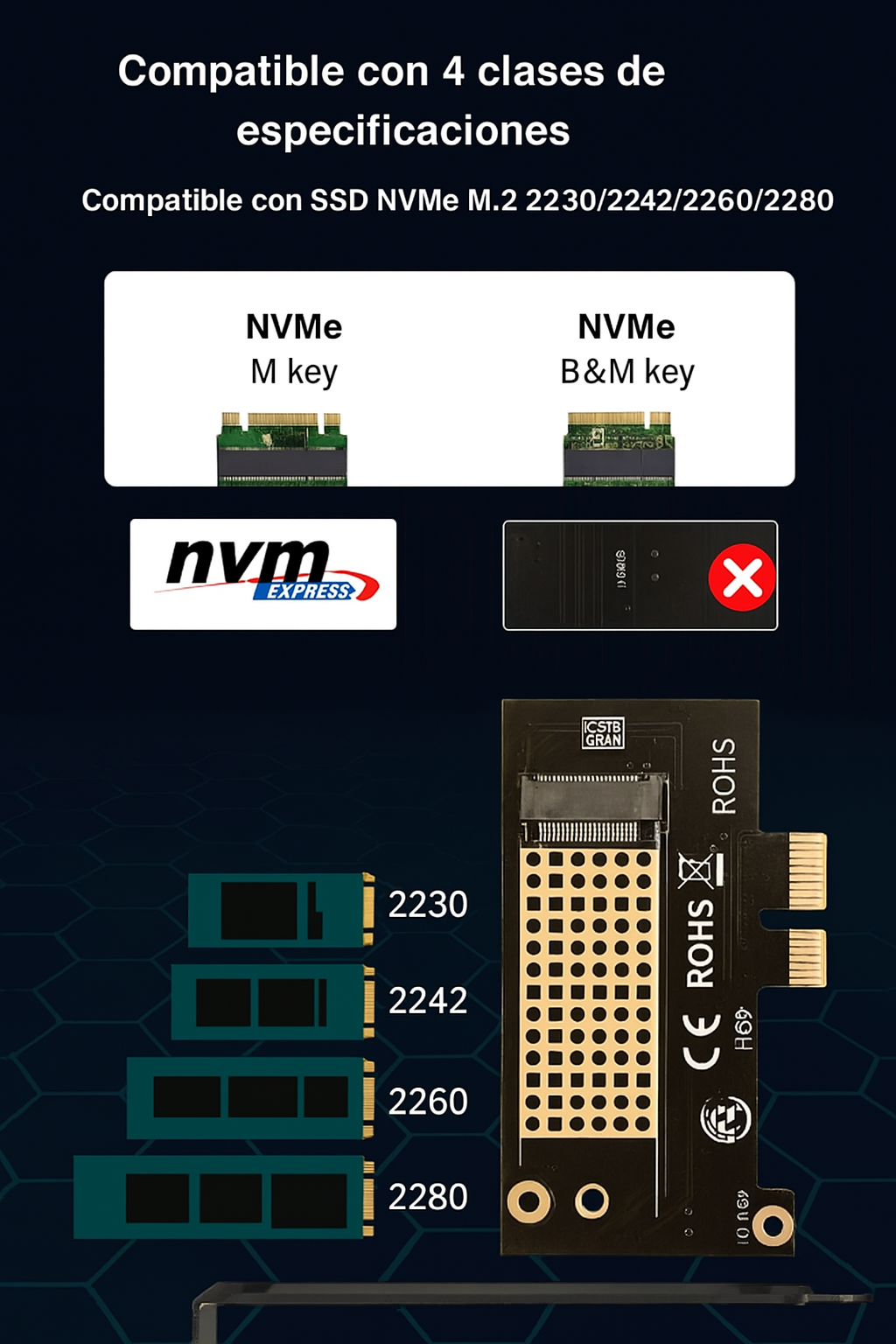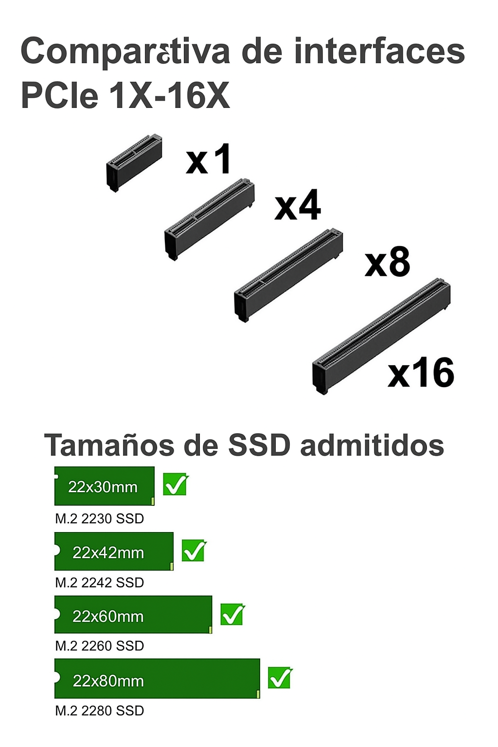Versatilidad de tamaños: Compatible con distintos factores de forma (desde 2230 hasta 2280), lo que te permite elegir la capacidad y marca de SSD que mejor se adapte a tus necesidades.