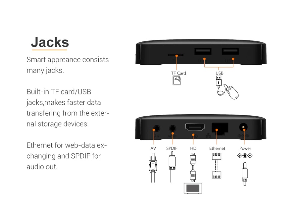 La mayoría de las TV box android utilizan una interfaz de vídeo HDMI para reproducir vídeo y sonido en un televisor.Conectando el cable HDMI a un televisor, encendiendo la tv box, y tener el televisor en la entrada HDMI correcta es todo lo que se requiere.